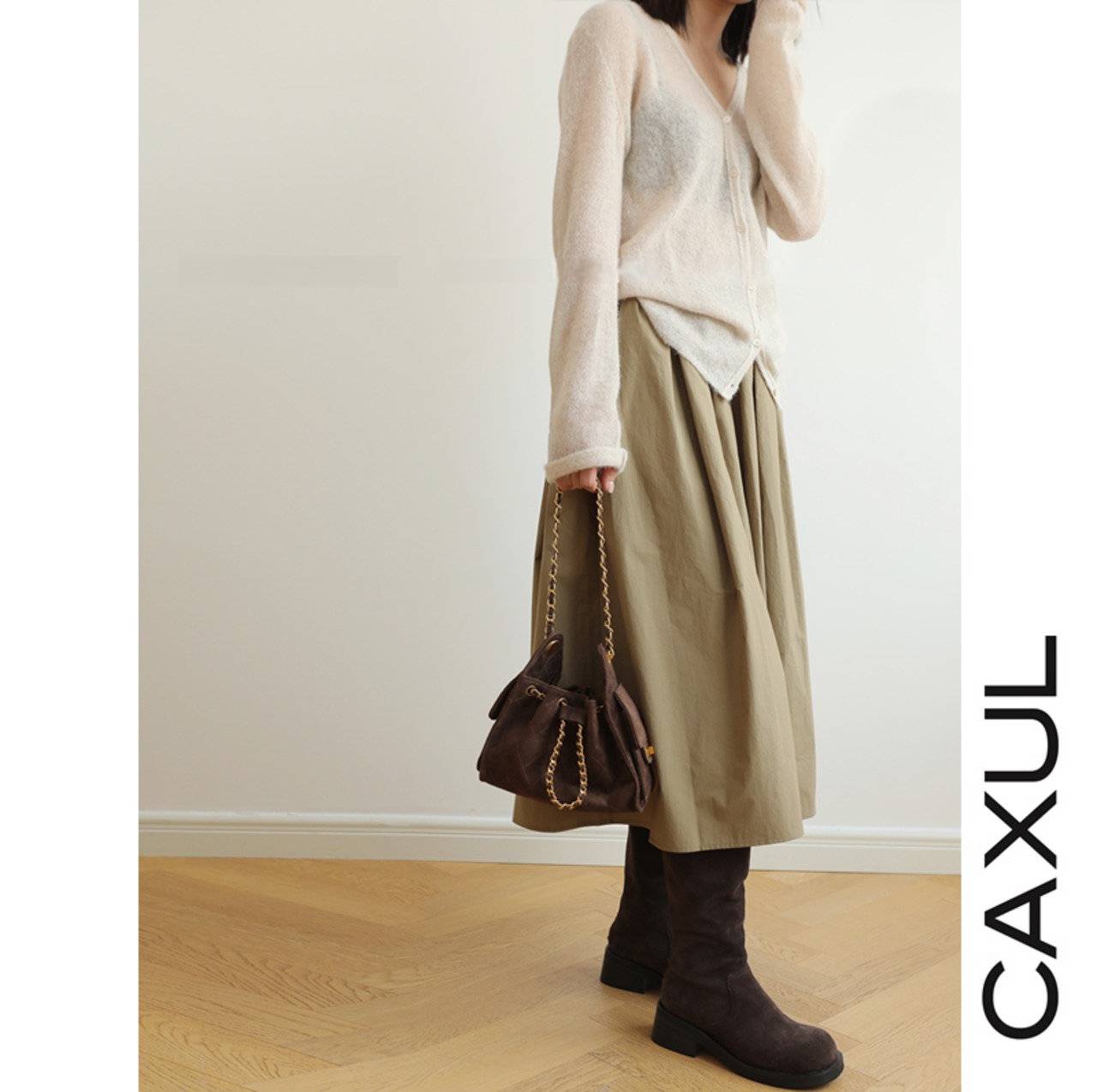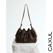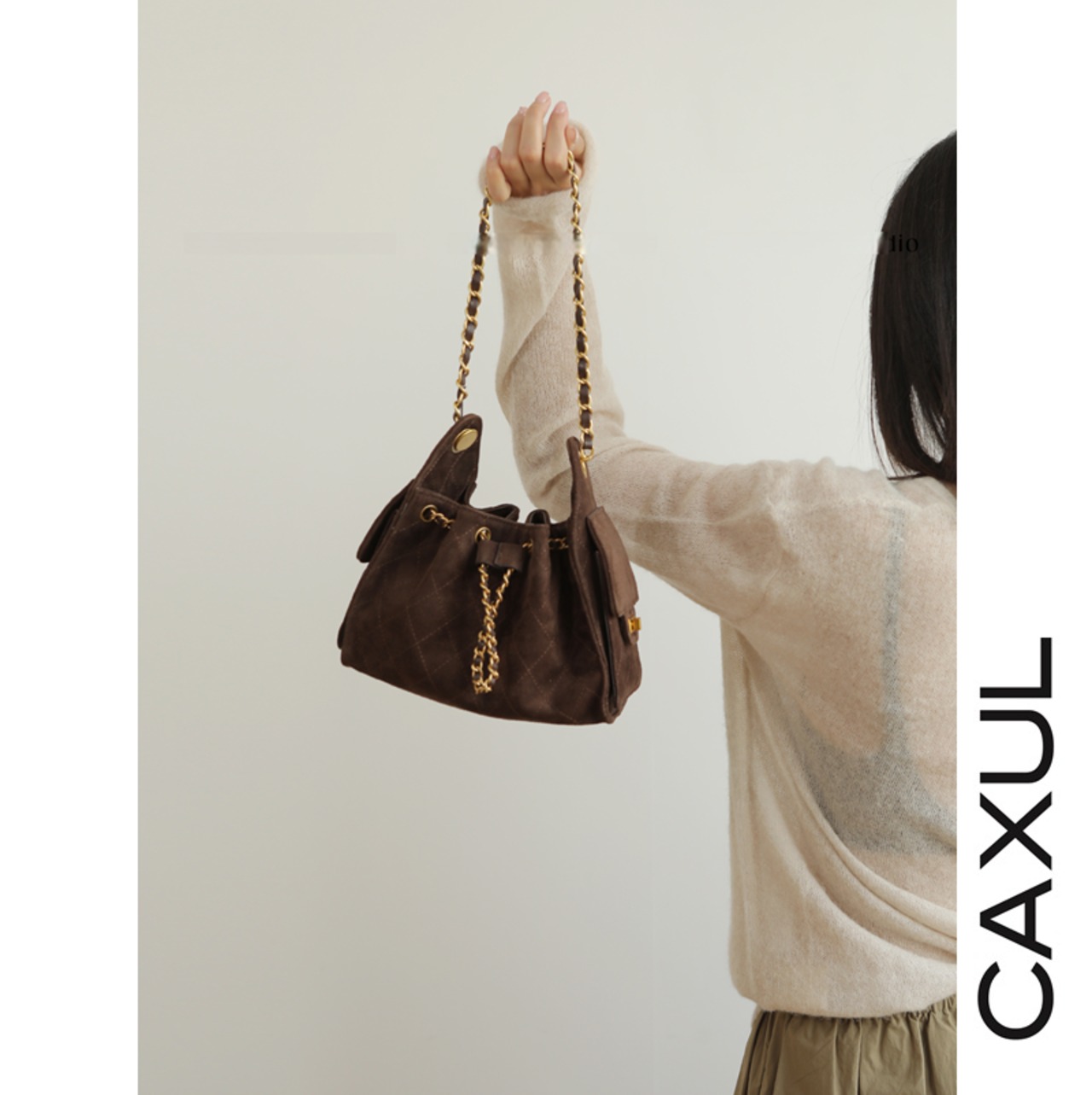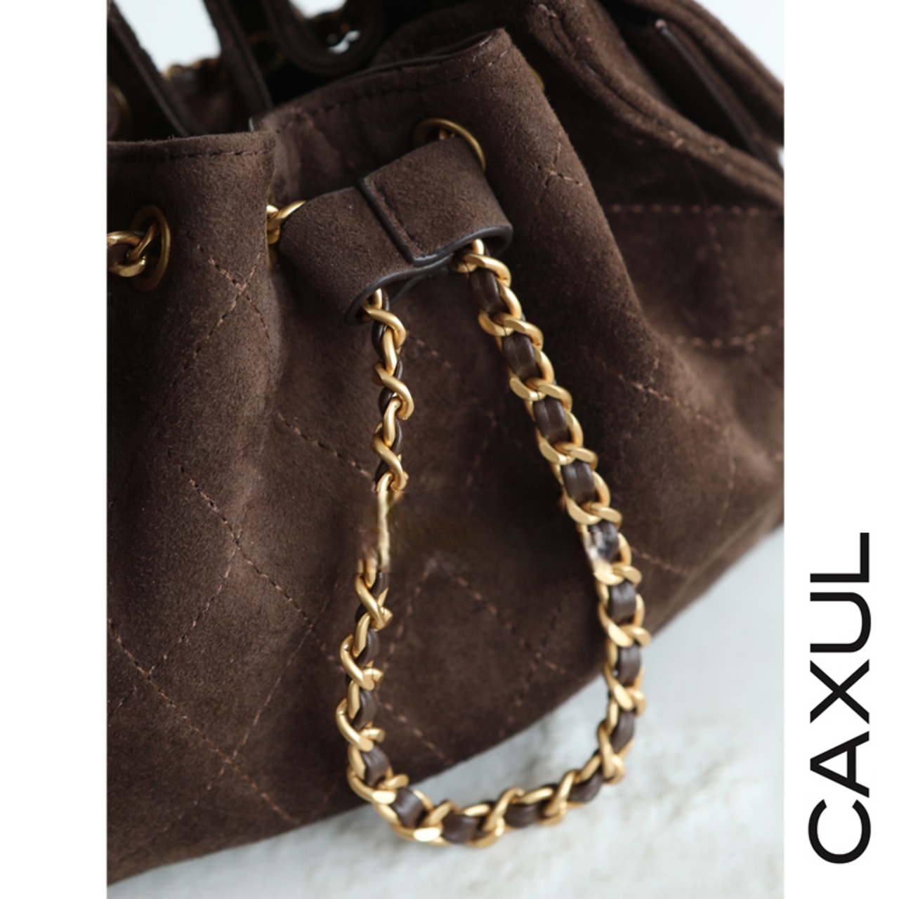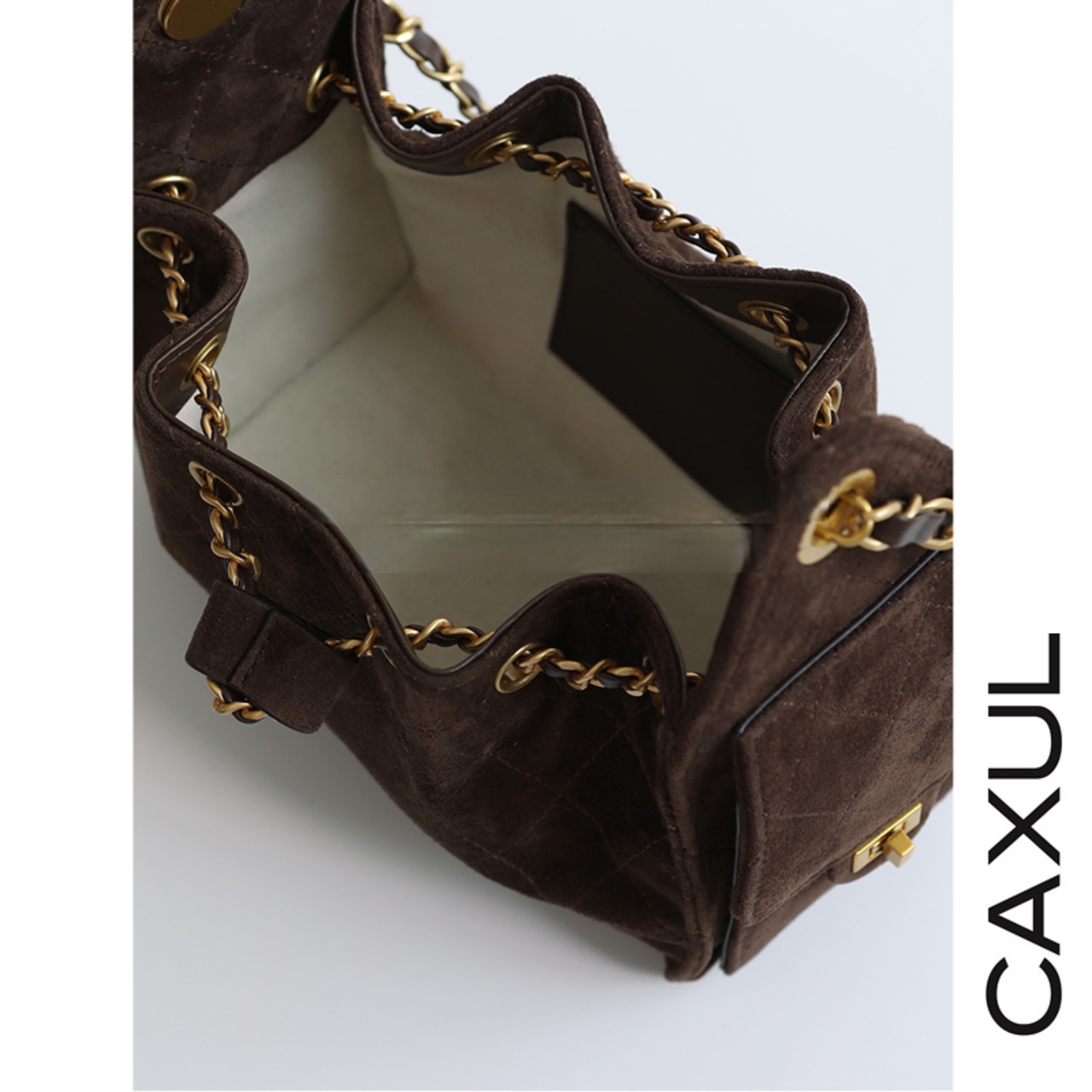 シープヌバックの優雅な質感が魅力のチェーンバッグ。バッグの口はチェーンのドローストリング仕様で締まり具合を自由に調節でき、開け閉めが楽!サイドには立体ポケットをあしらい、小物を整理して収納可能です! 季節感を先取りし、小物からスタイリングを楽しむのにぴったりなアイテムです。携帯や折りたたみ傘がしっかり収納できる適度なサイズ設計で、実用性も抜群です。