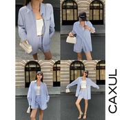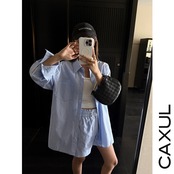 爽やかなブルーストライプとシックなホワイト×グレーのストライプを組み合わせたシャツとショートパンツのセットアップ。シャツはすっきりとしたシルエットで縦ラインを強調し、スマートな印象に。ショートパンツはウエストゴム&ドローストリング仕様で快適さと調節性を両立。後ろポケット付きで実用性もあり、モードな抜け感とリラックス感を兼ね備えた大人のカジュアルスタイルを演出します。