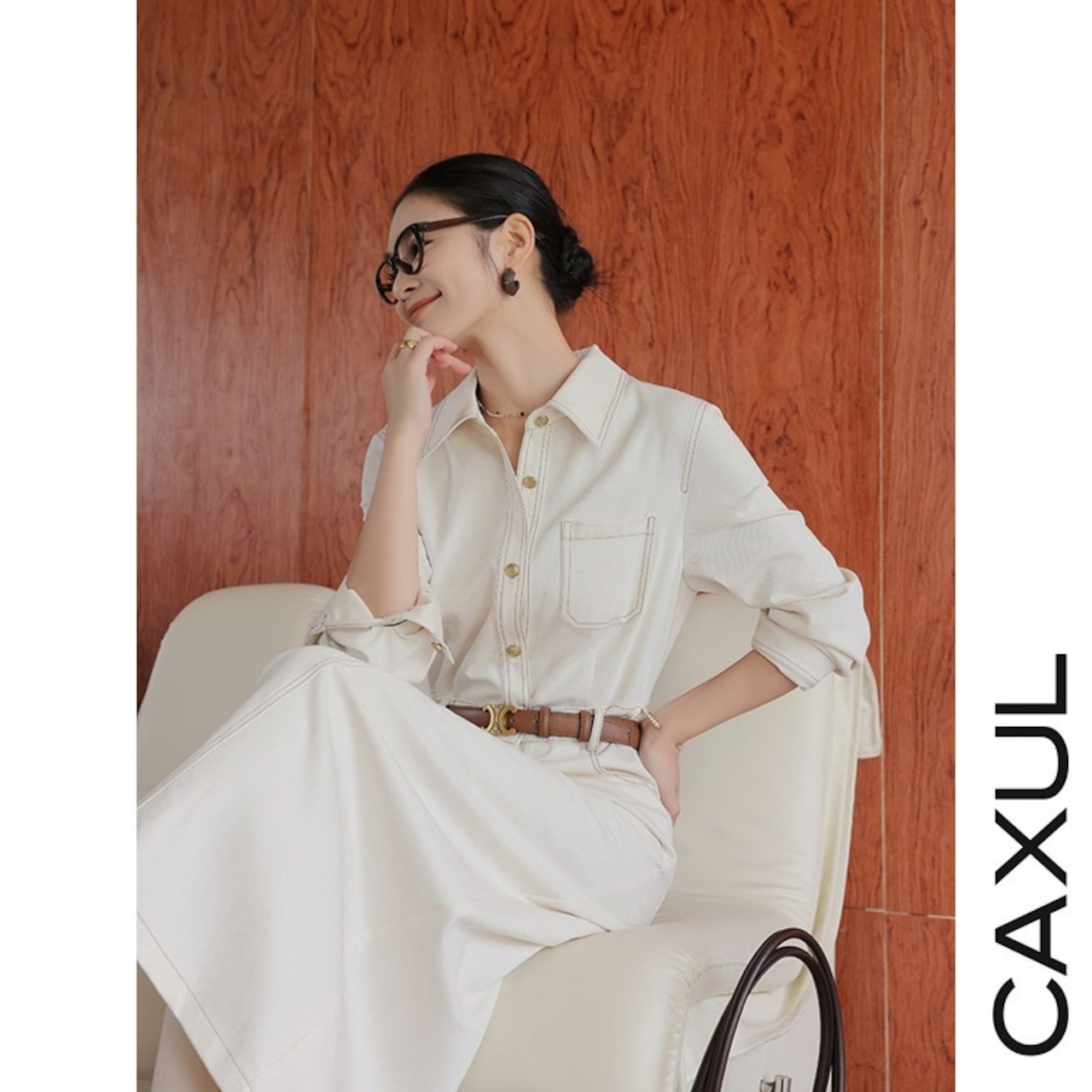 上品なホワイトデニム調素材を使用したロング丈シャツワンピース。ゴールドボタンとステッチの効いたデザインが、シンプルながらも大人の洗練を感じさせます。ベルトでウエストマークすればスタイルアップ効果も◎。オン・オフ問わず着回せる、1枚でコーディネートが完成する万能アイテムです。