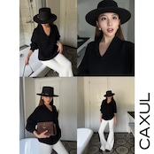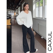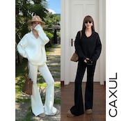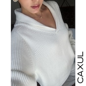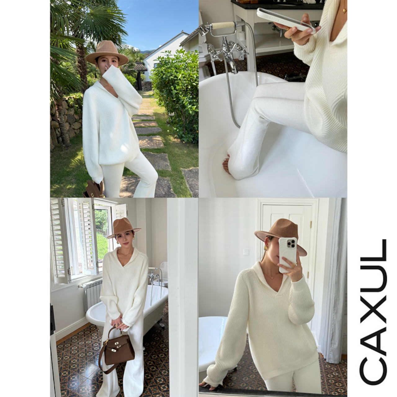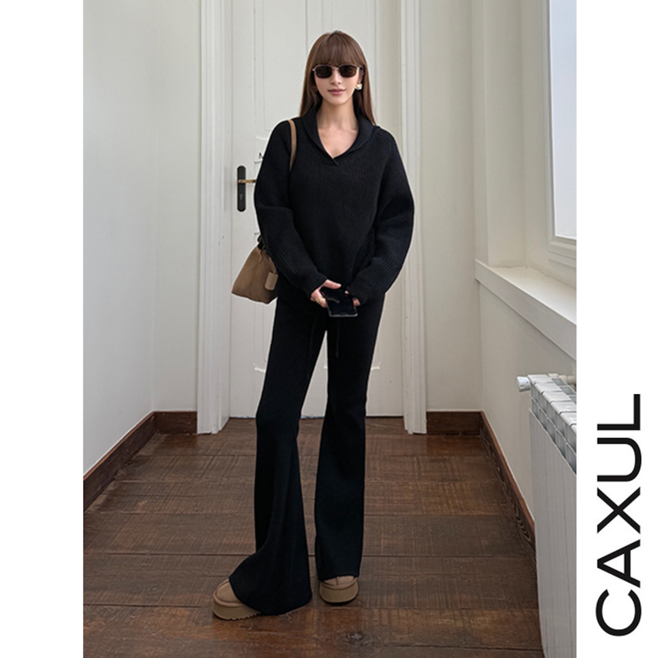 Vネックにショールカラーを配したデザインが首元を美しく魅せるニットトップス。リブ編みの立体感が上質さを引き立て、快適な着心地を叶えます。スリムな腿から裾に向かって広がるフレアパンツとのセットアップで、洗練されたシルエットと抜け感のあるスタイルを演出します。