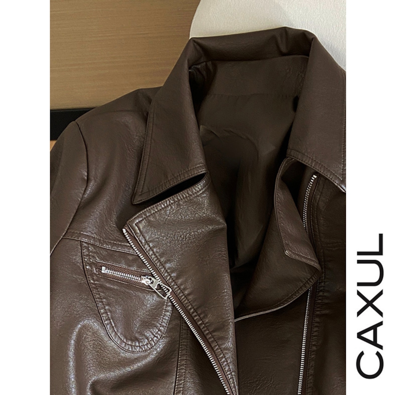 上品な艶を放つPUレザーを使用したショート丈のバイカージャケット。しなやかで軽い質感ながら、ほどよくハリのある素材がシルエットを美しく保ちます。コンパクトな丈感がスタイリングしやすく、シーズンレスに羽織れる、モードで洗練された一着です。