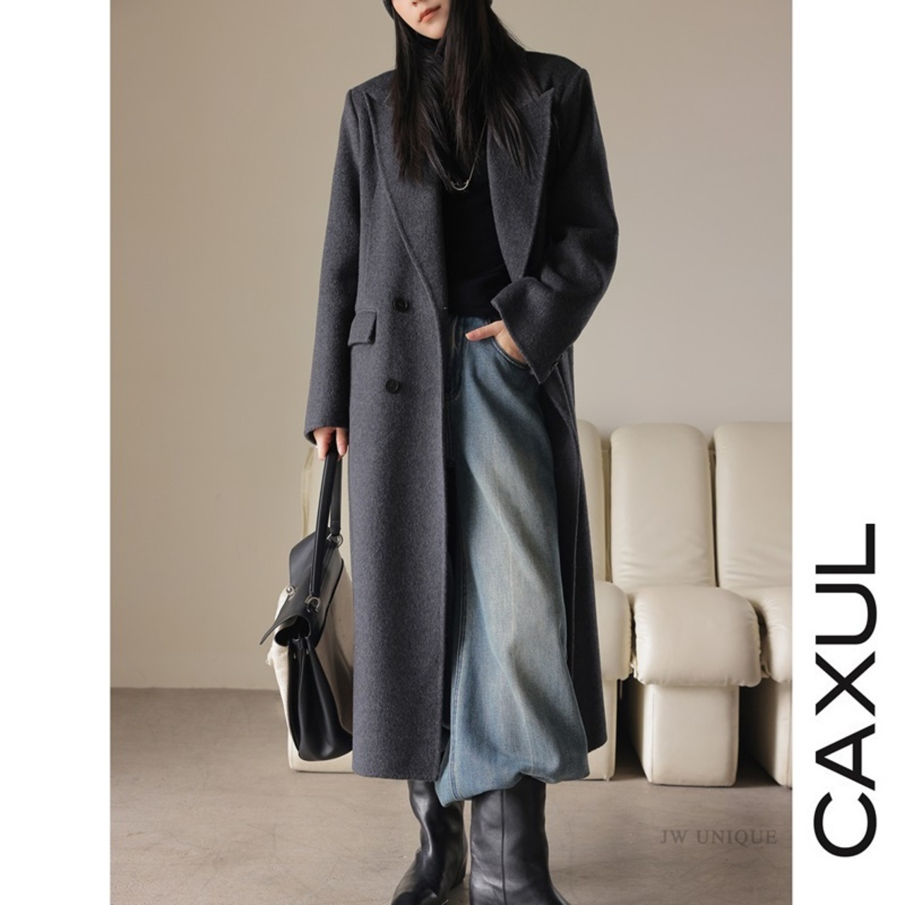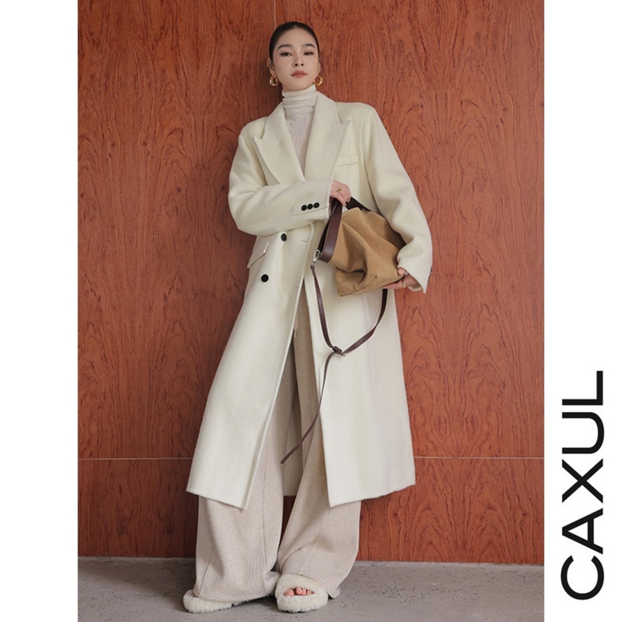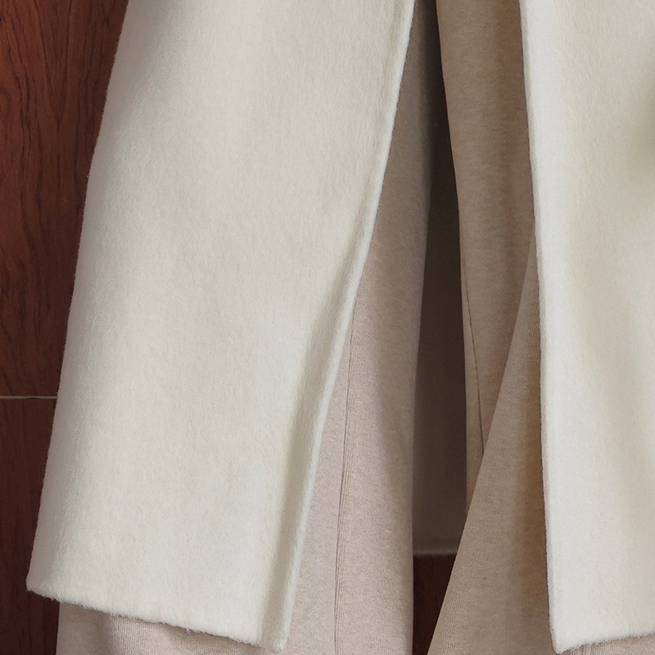 70%ウールを使用したダブルフェイス仕立てで、柔らかく暖かいロングコート。軽やかな着心地ながら、テーラードカラーとダブルボタンが縦のラインを美しく強調します。ミニマルで洗練された表情は、デイリーにもオケージョンにも対応。冬の装いに静かな上品さを添える一枚です。
