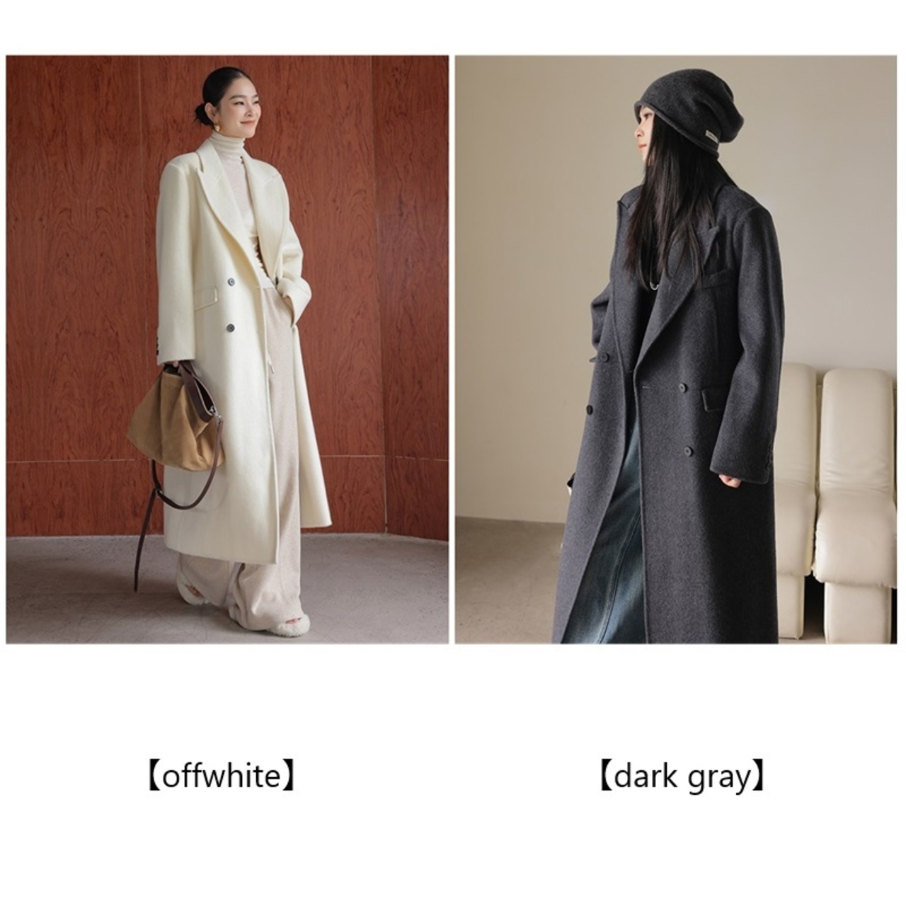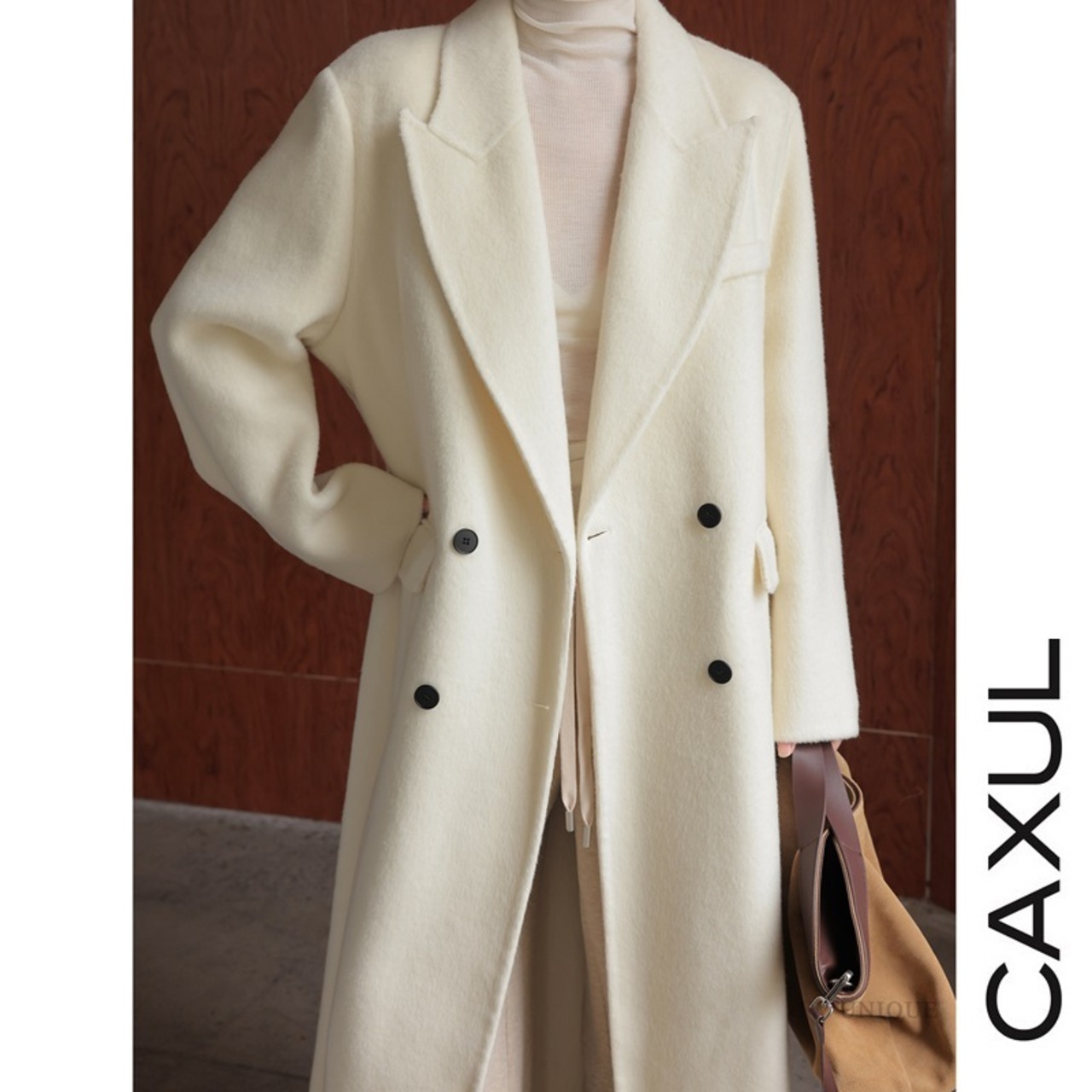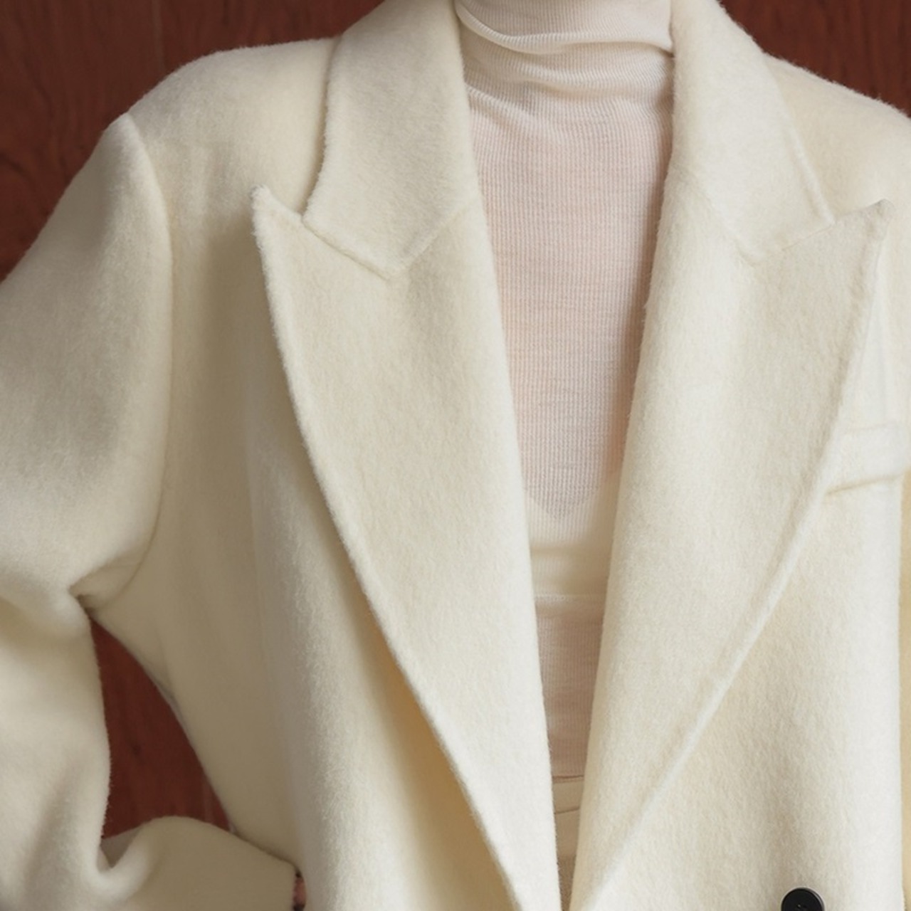 70%ウールを使用したダブルフェイス仕立てで、柔らかく暖かいロングコート。軽やかな着心地ながら、テーラードカラーとダブルボタンが縦のラインを美しく強調します。ミニマルで洗練された表情は、デイリーにもオケージョンにも対応。冬の装いに静かな上品さを添える一枚です。