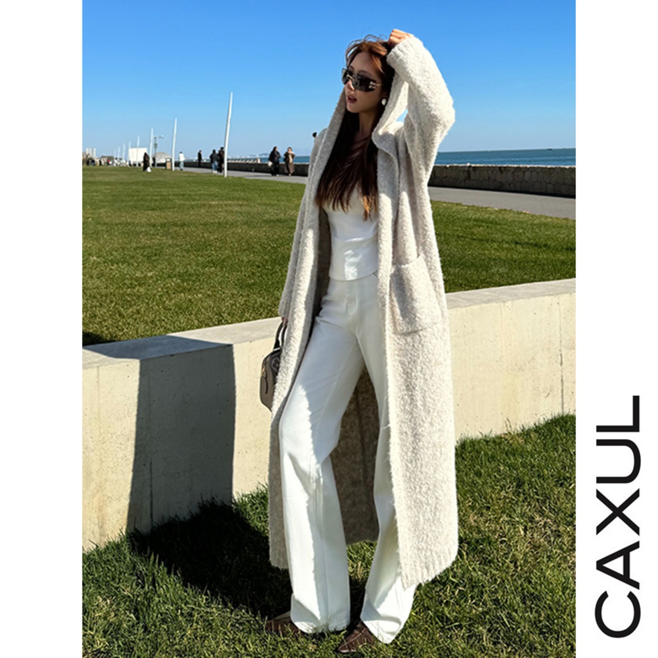 軽くて暖かいループヤーン素材を使用した、フード付きロングニットカーディガン。高密度のループパイルがふんわりとした立体感を生み、優れた防風・保温性を発揮します。大きめポケットがアクセントになり、実用性とデザイン性を両立。裾と袖口はリブ仕様で型崩れしにくく、リラックスしたスタイルに上品さを添える一枚です。