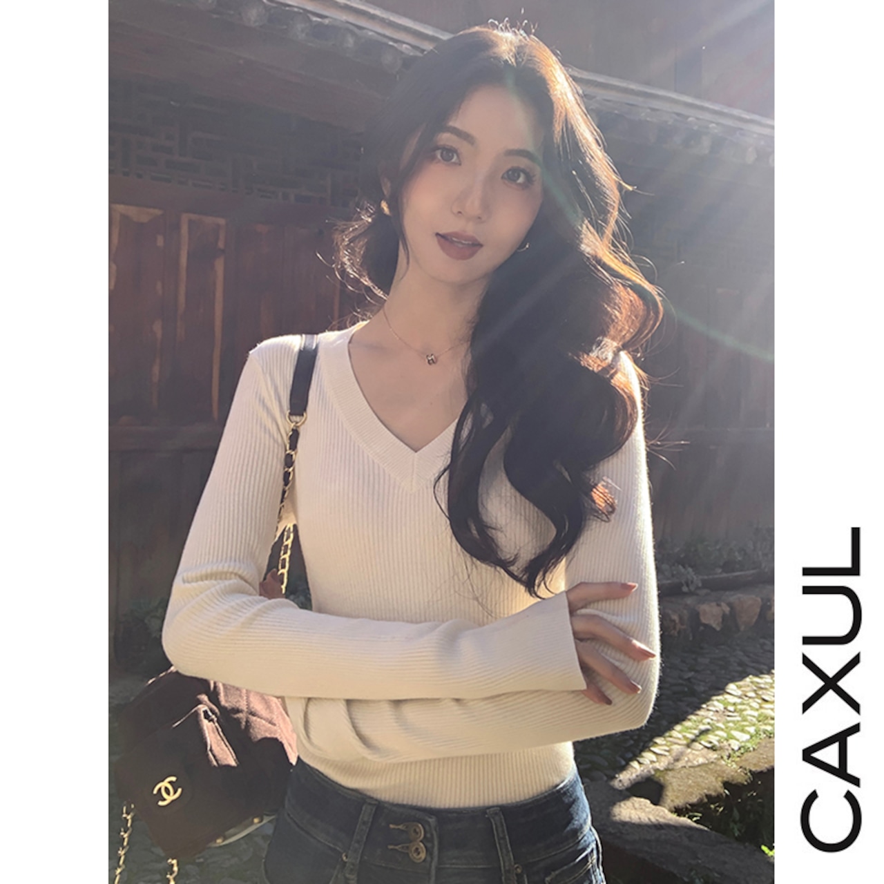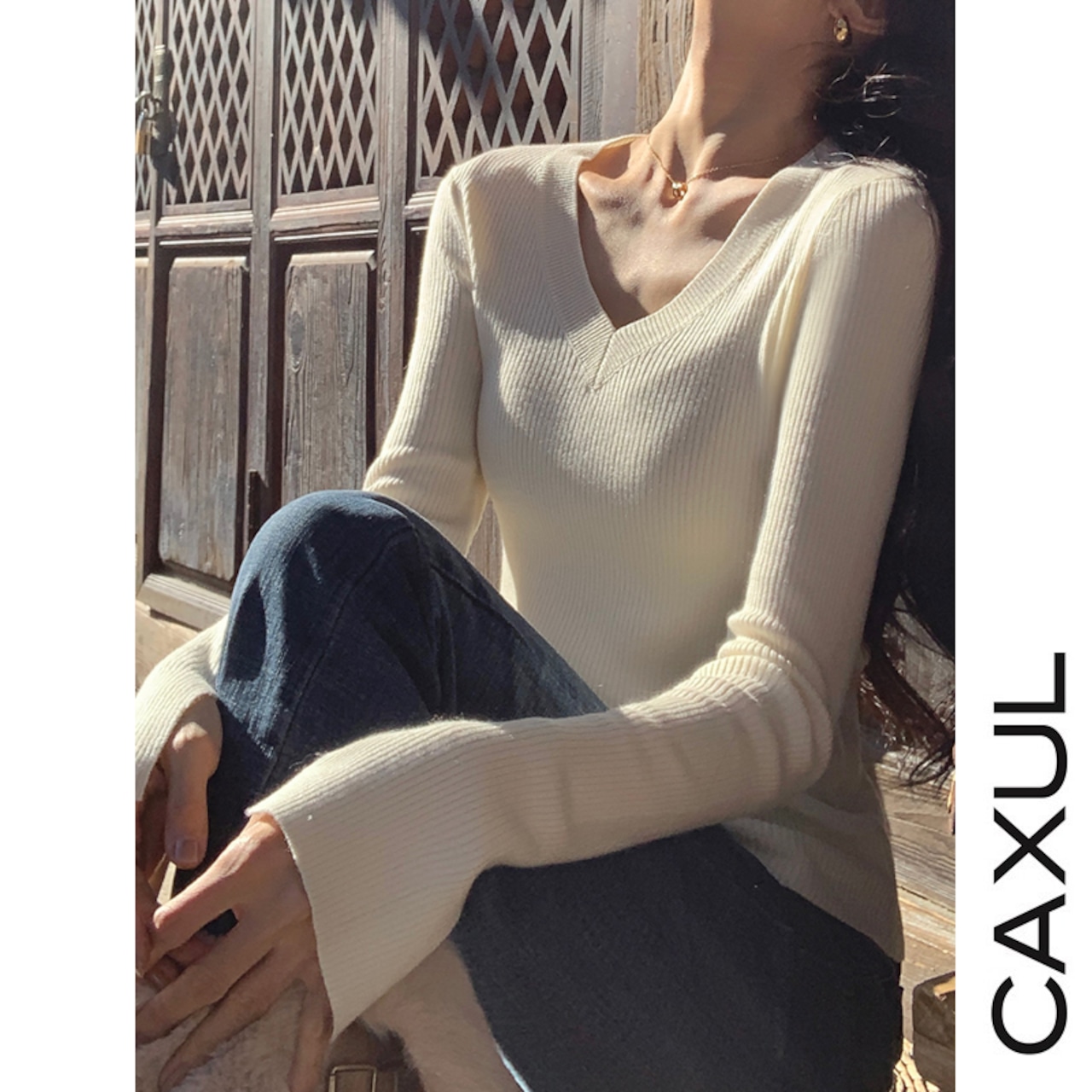 上質なシルクとウールのblend糸を使用したVネックニットトップス。
