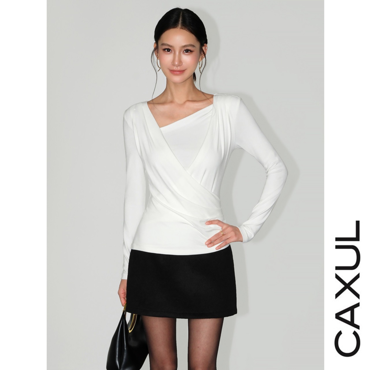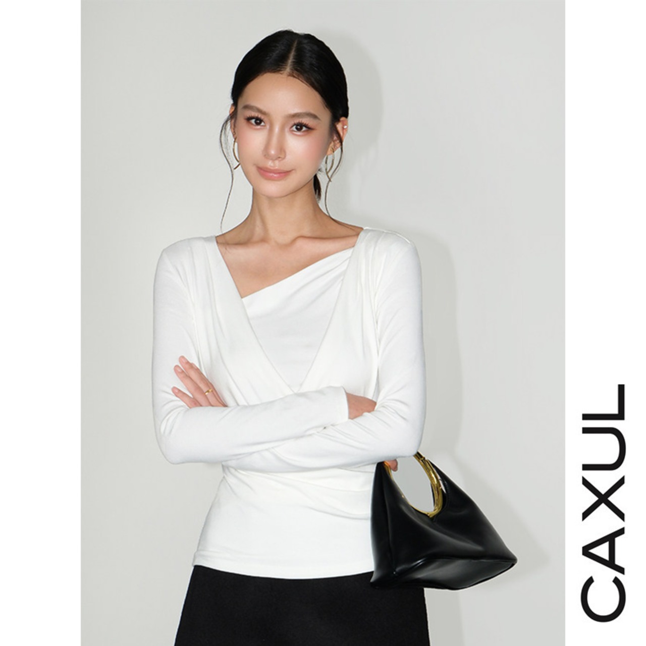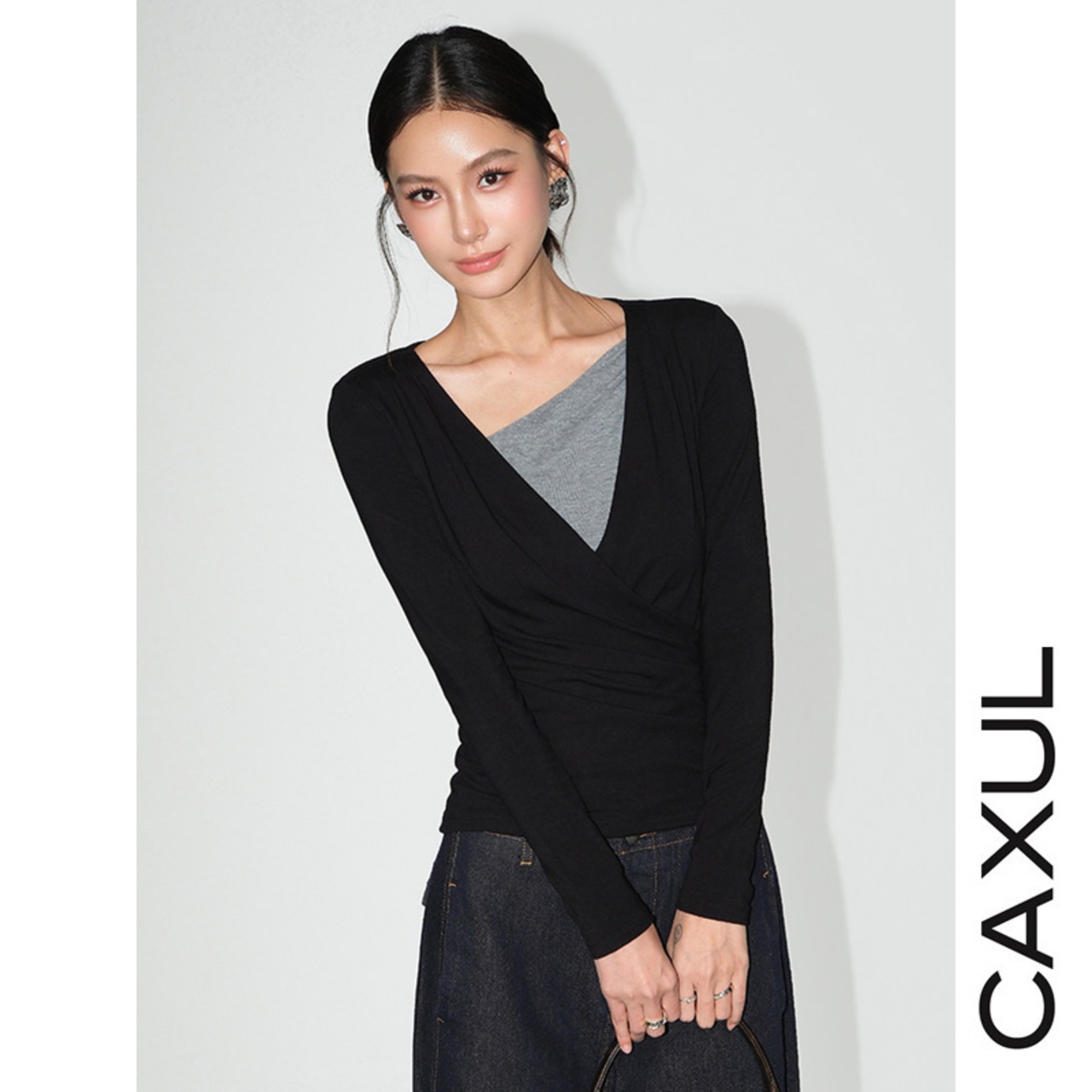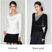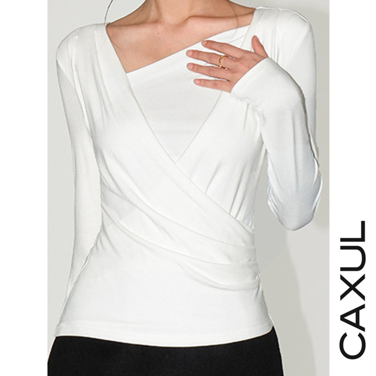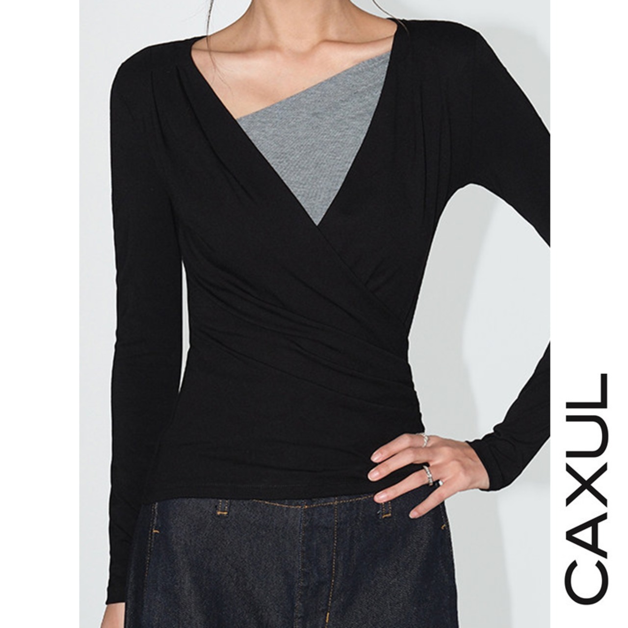 フロントにレイヤード風のVネックデザインを施した、表情のあるロングスリーブのカットソー。流れるようなネックラインが顔まわりをすっきりと見せ、鎖骨を美しく引き立てます。胸元から自然に入ったプリーツが立体感を生み、さりげなくウエストラインを整えるのもポイント。適度なフィット感で身体に沿い、一枚で洗練されたスタイリングが完成するアイテムです。