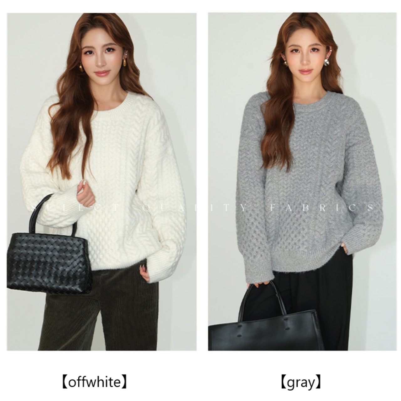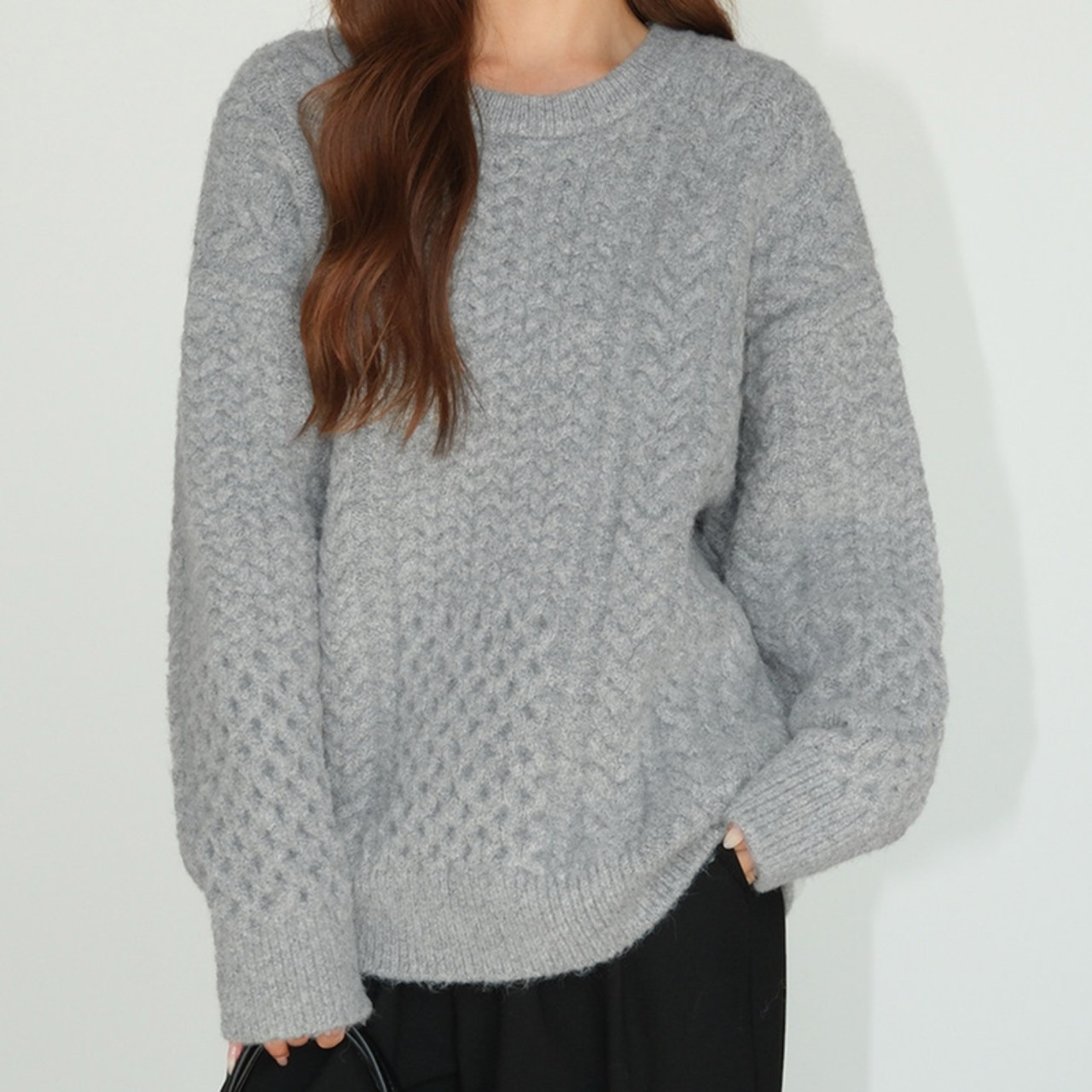 異なるケーブル編みを組み合わせで、立体的な表情に仕上げたクルーネックプルオーバー。程よくゆとりのあるドロップショルダーが身体のラインを拾いすぎず、自然体で着られる一枚です。首元・袖口・裾はきゅっと締まったリブ仕様で、全体の印象を引き締めつつ型崩れしにくいのも魅力。ヴィンテージライクな雰囲気を残しながら、日常に寄り添う上質なニットです。