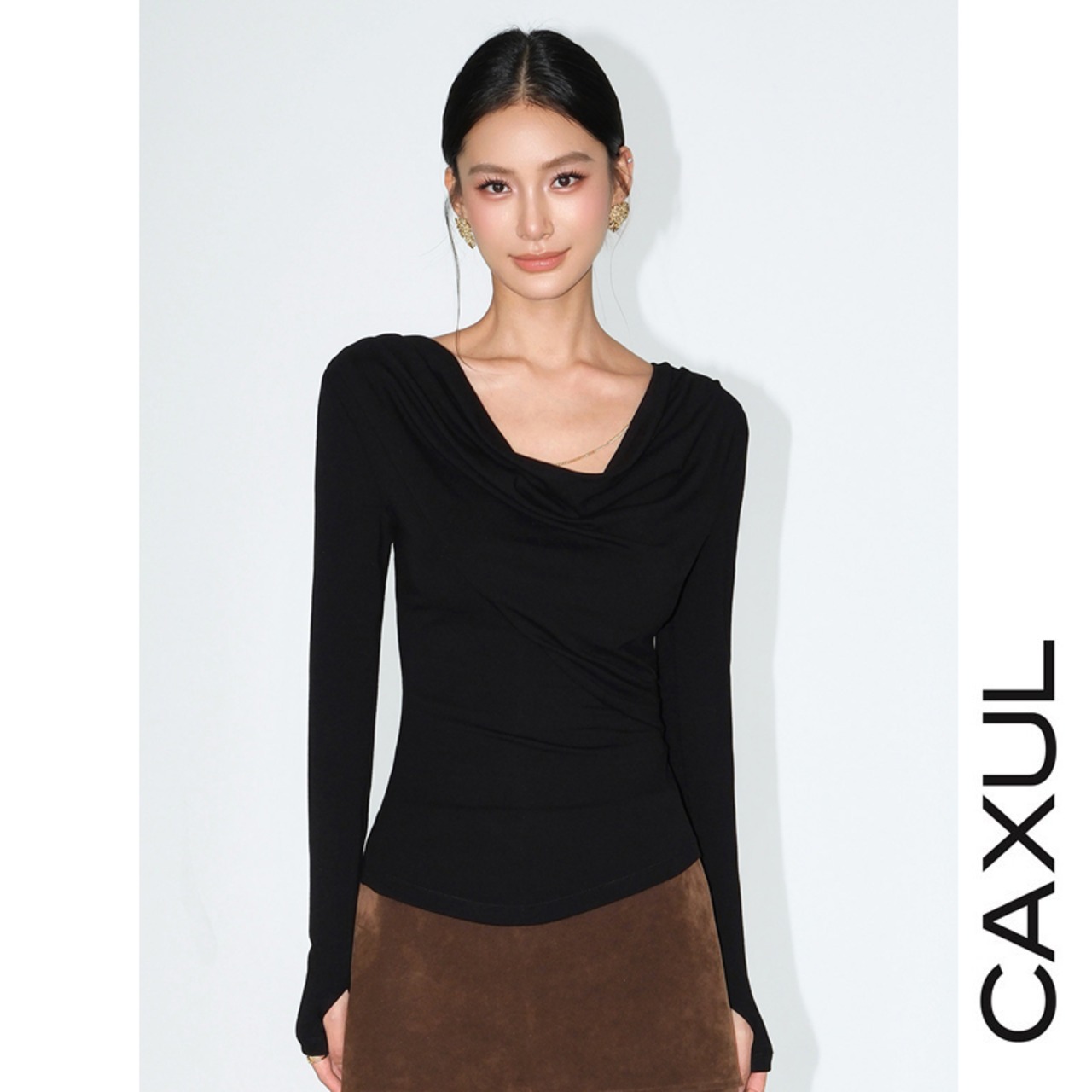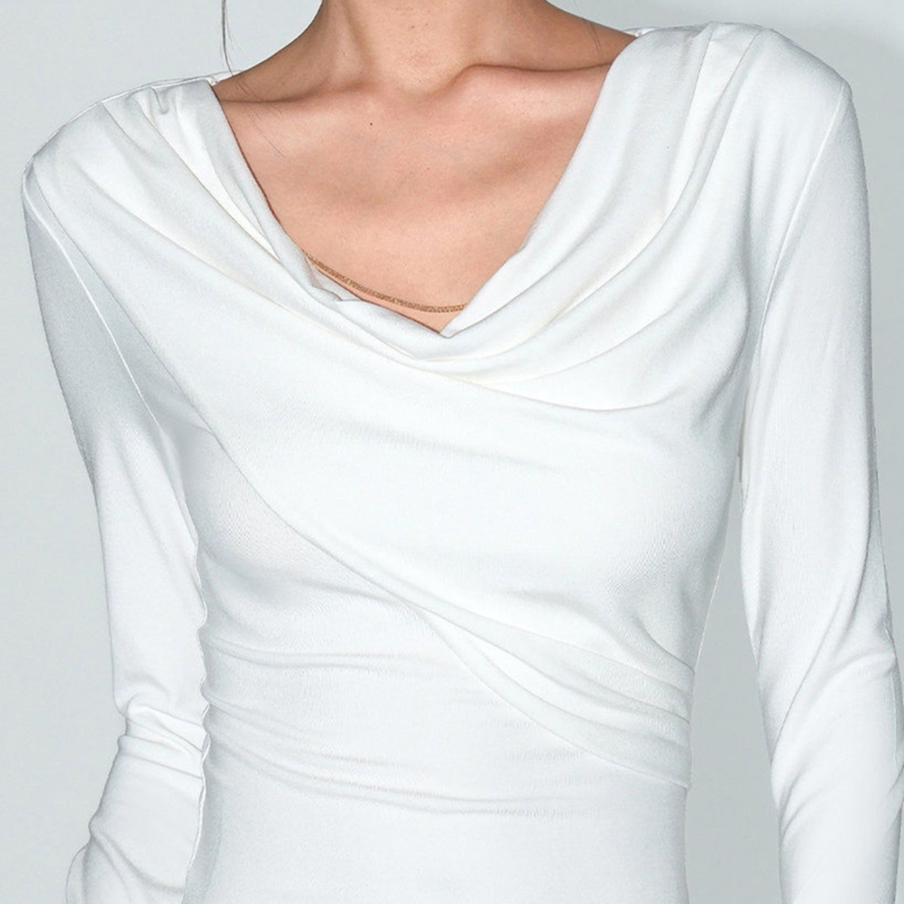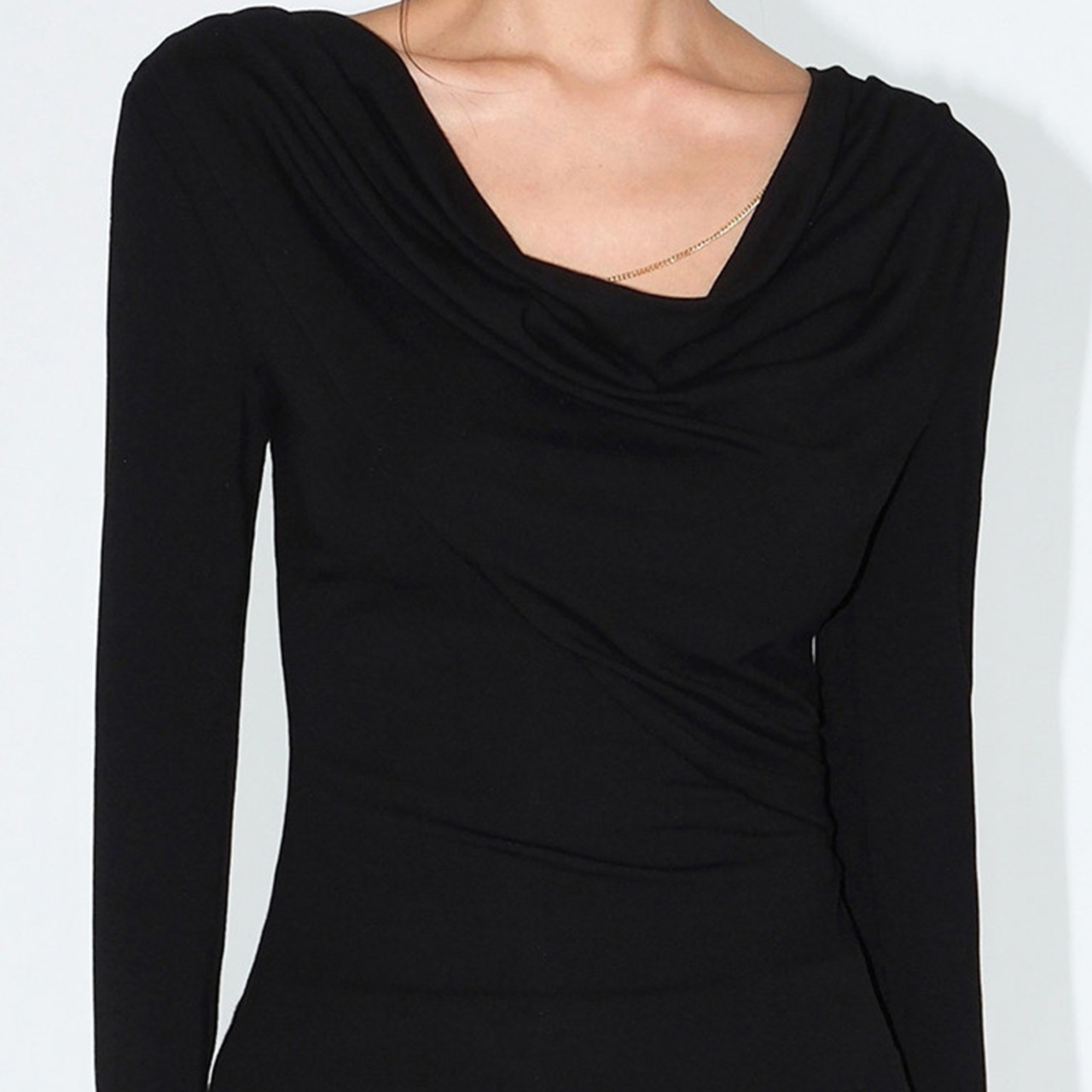 美しいドレープネックがデコルテのラインを引き立てるトップス。ネックラインにあしらわれたチェーンがアクセントとなり、さりげない華やかさをプラスします。サイドウエストにはプリーツを施し、自然にラインを整えながら腰まわりをすっきり見せてくれるデザイン。程よく身体に沿うスリムフィットで、きつさや張り付き感のない快適な着心地も魅力です。ストレッチレーション素材でこれから春まで着られる1着です。