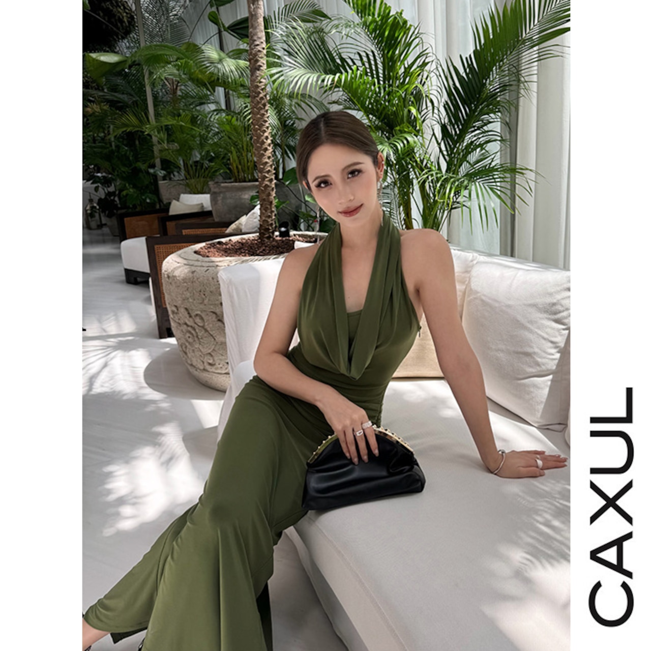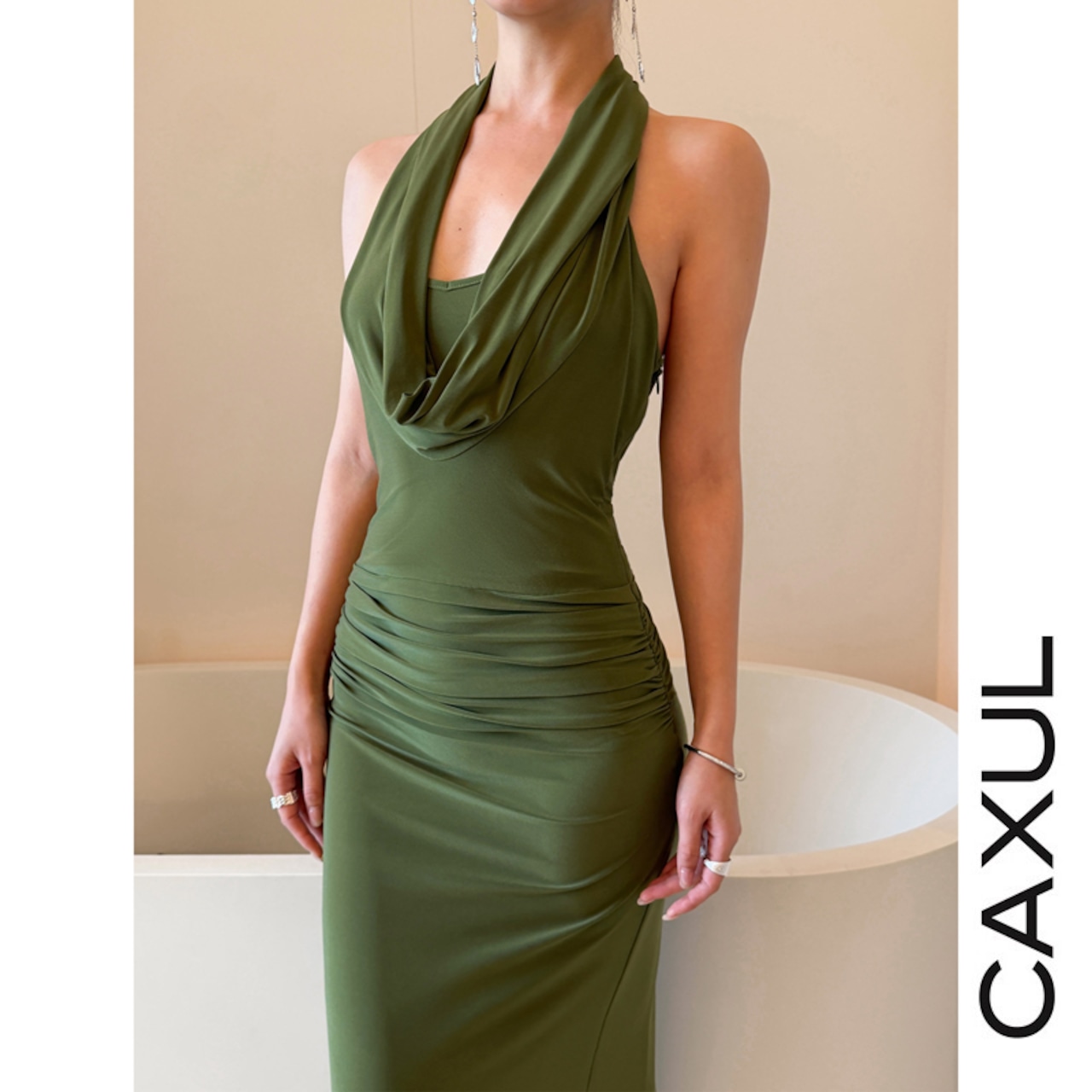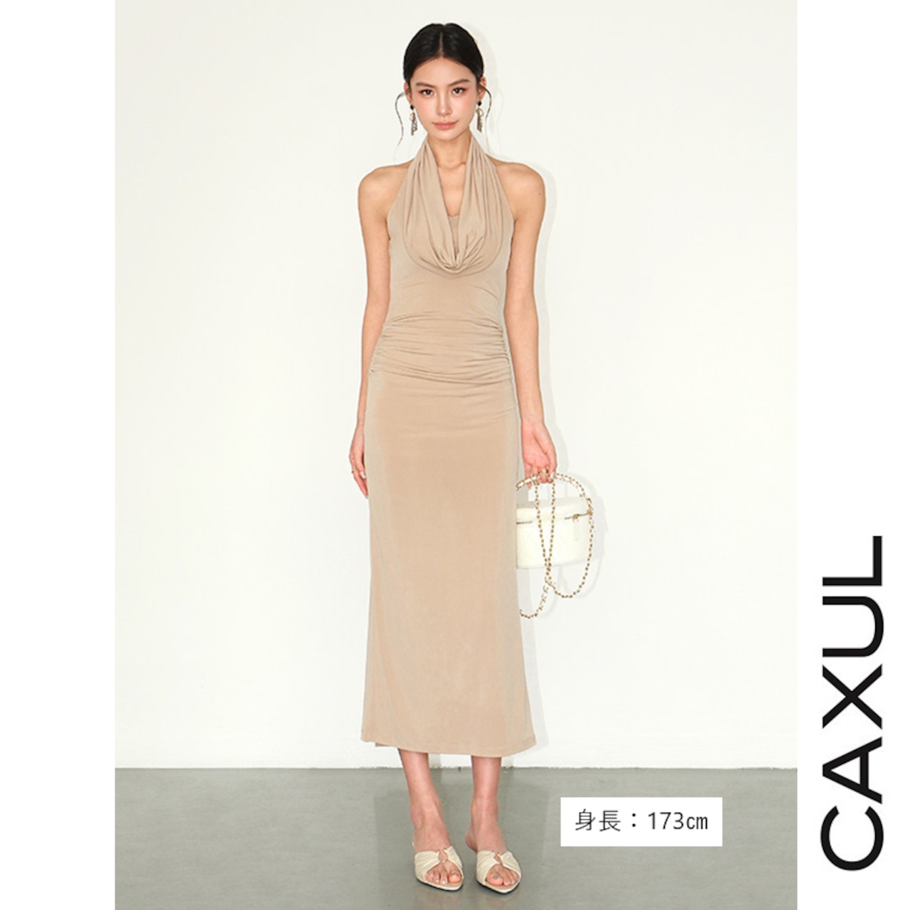 エレガントなドレープネックが印象的なホルターネックワンピース。肩のラインを美しく引き立て、首元をすっきりと長く見せてくれます。体に程よくフィットするスリムシルエットに、ウエスト両サイドのタックが立体感をプラス。くるぶし丈のマキシラインとサイドスリットが、歩くたび軽やかな女性らしさを演出します。伸縮性のあるニットジャージ素材で、きれいなシルエットと快適な着心地を両立した一着です。
