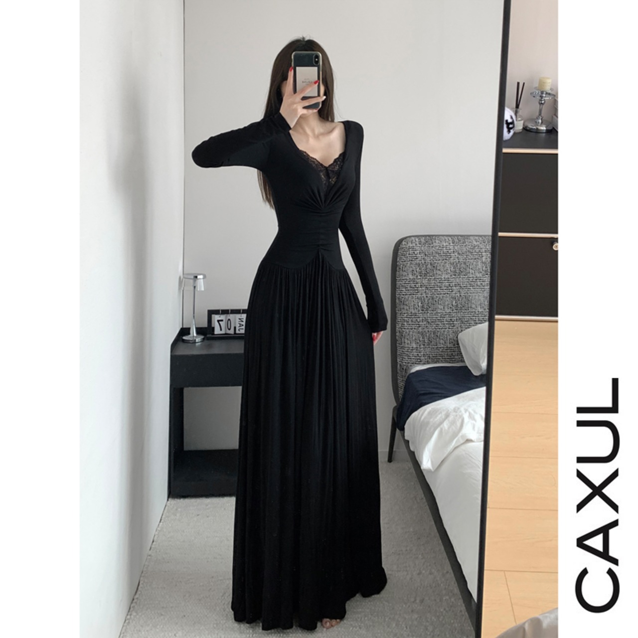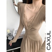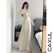 フロントのギャザーが美しいドレープを生み出すマキシワンピース。深めのVネックにレースをあしらいデコルテをすっきりと見せ、女性らしいラインを引き立てます。ウエストラインはslimfitし、裾にかけて広がるフレアシルエットが自然に体型をカバーし、スタイルアップ効果も。レーヨン混のカットソー素材でやわらかく伸縮性があり、着心地の良いdressです。 【color】 black・ivory・purple・nude 【shirt size】 S :ワンピース丈 127/バスト 60+/ウエスト 54+/袖丈 55/肩幅 32+(cm) M :ワンピース丈 128/バスト 64+/ウエスト 60+/袖丈 56/肩幅 33+(cm) L :ワンピース丈 129/バスト 68+/ウエスト 64+/袖丈 57/肩幅 34+(cm) ※測定により1~3㎝の誤差が生じることがございます 【material】 viscose92%、spandex8% 【model】 身長160cm/45kg 【S】 【原産国】 中国 【お洗濯】 ドライクリーニング推奨、漂白不可、低温アイロン、 乾燥機不可、吊るし干し 【発送スケジュールにつきまして】 ご入金完了後、ご注文いただきました順に順次対応させていただきます。 商品は CAXUL海外検品センターにて品質確認を行ったのち、国際便にてお届けいたします。 通常、ご注文からお届けまで 2〜4週間前後 お時間を頂戴しております。 (商品不備による入れ替えや物流混雑時や通関の状況により前後する場合がございます) 予めご了承くださいますようお願い申し上げます。 【お支払い方法】 ・クレジットカード ・各種キャリア決済 ・Amazon pay ・後払い(pay ID) 【注意事項】 ・タイミングによっては 商品在庫切れにより ご注文をキャンセルさせて頂く場合がございます。予めご了承くださいませ。 ・海外に検品・梱包部署を設け一着一着丁寧に検品・梱包させていただきます。 ・商品の色味は、お手持ちのスマートフォンの画面によって実物と若干異なる場合がございます。 ・イメージ違いやサイズ交換等、お客さまご都合による交換、返品は対応出来かねます。 ・詳細はshop aboutをご確認頂きますようお願い申し上げます。 その他ご不明な点等ございましたらお気軽にお問い合わせくださいませ。 皆様の素敵な思い出に残る一着をお届けさせていただきます。 CAXUL is a registered trademark of Current Inc., Tokyo, Japan.